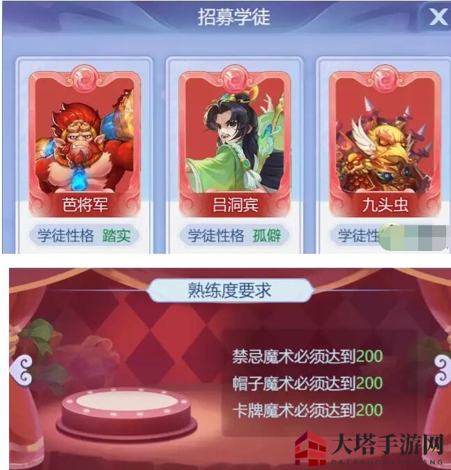 1、魔术巡演:最多可同时招募4种学徒,每日仅能参与一次巡演。不同巡演对魔术种类和熟练度有特定要求,完成所有熟练度条件即可获得100个魔术星币。注意,巡演开始后不可更改选择!