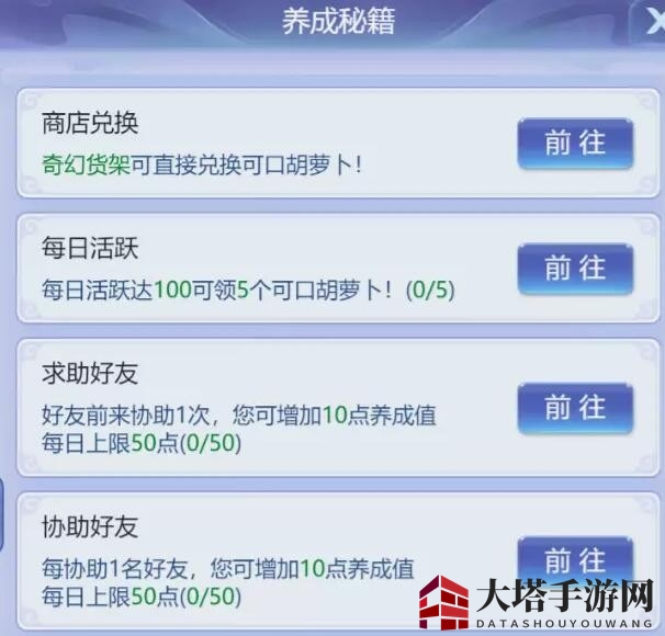 4、魔兔养成:每日活跃度达到100即可领取5根胡萝卜(相当于50养成值),每日上限50养成值。通过求助好友和协助好友可获得更多养成值,活动商店同样可兑换胡萝卜。累积1000养成值即可获得魔术白兔坐骑。活动结束后,未使用的胡萝卜将转化为30个赤铁矿。