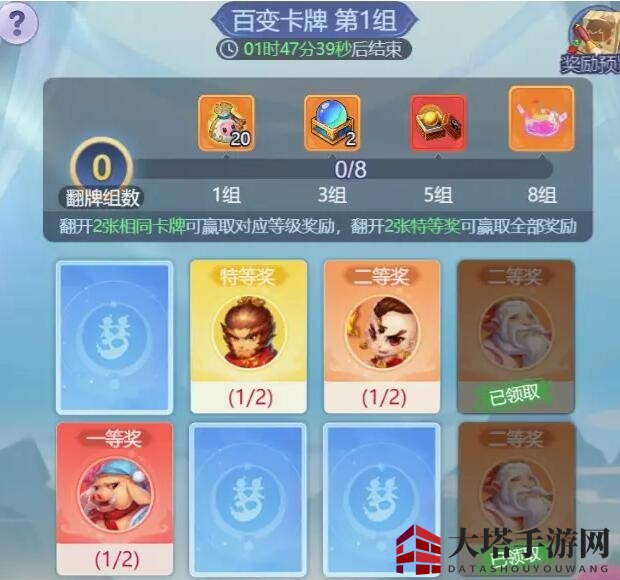 2、百变卡牌:仅需1000仙玉,即可解锁任意一张卡牌,凑齐两张相同的卡牌即可获得奖励。若幸运地翻出两张特等奖卡牌,即可赢得所有卡牌奖励,并重置牌组。活动结束时,魔术金币将兑换为静玉。